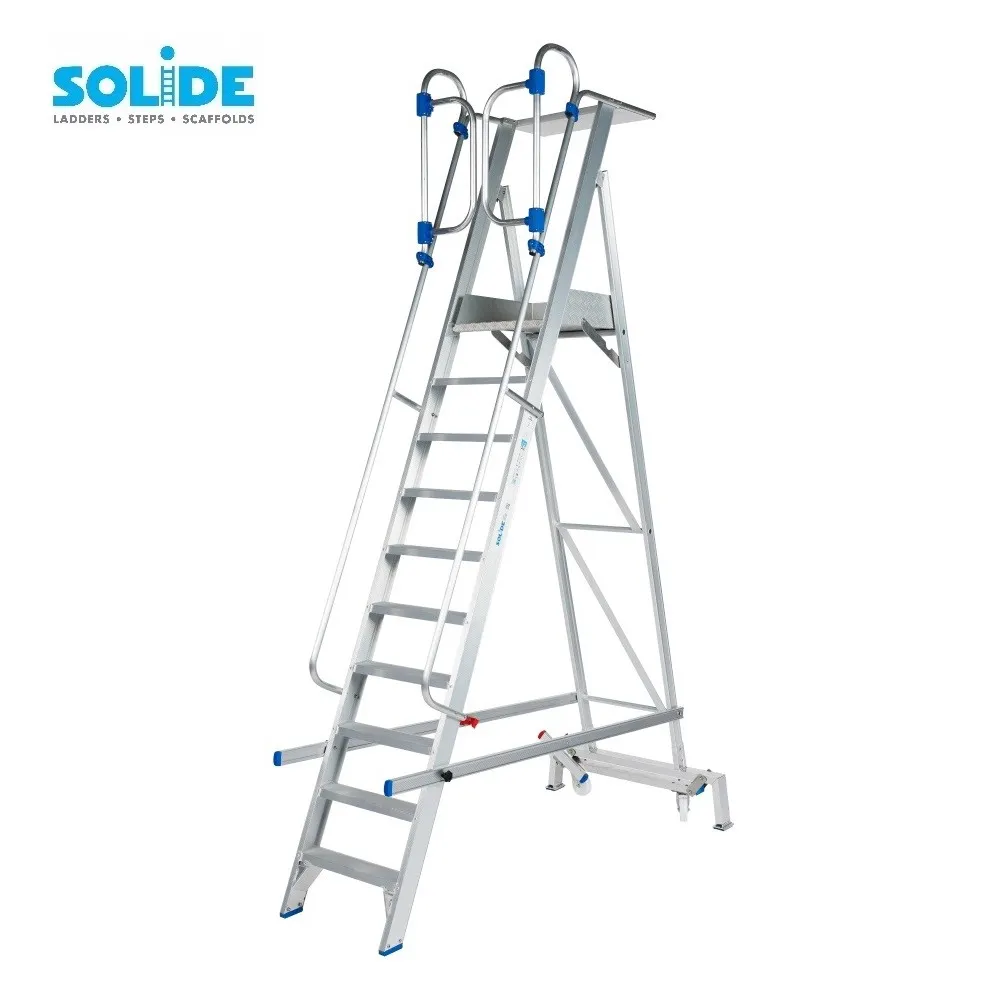 Die Solide klappbare mobile Plattformtreppe mit 10 Stufen ist eine sichere und praktische Lösung für Arbeiten in der Höhe in Lagern, Werkstätten und industriellen Umgebungen. Diese fahrbare Aluminium-Plattformleiter verfügt über rutschfeste Stufen, eine großzügige Arbeitsplattform von 600 x 510 mm mit Fußleiste sowie eine praktische Werkzeugablage von 600 x 280 mm.