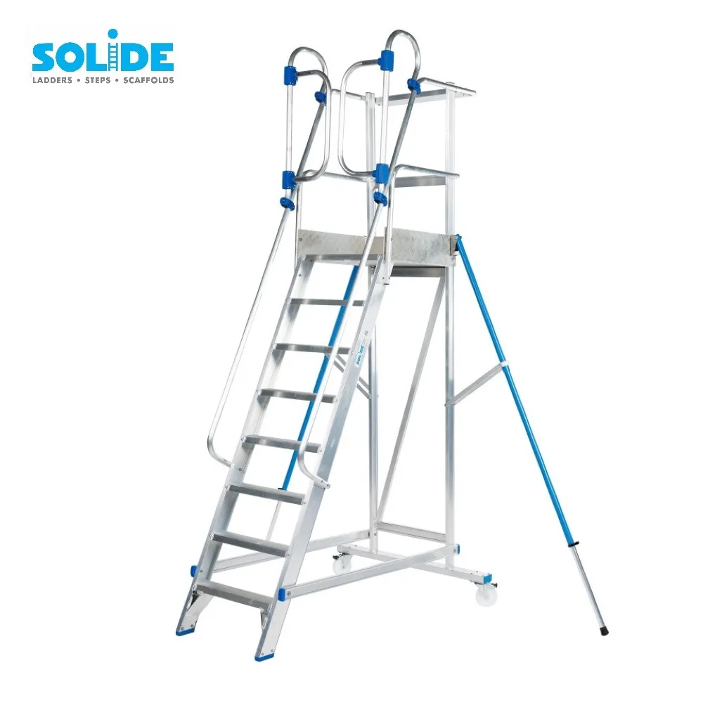 Robuste, fahrbare Aluminium-Podestleiter für sicheres Arbeiten in der Höhe in Lagern und industriellen Umgebungen. Die Podesttreppe ist mit einem großzügigen Podest und umfangreichen Sicherheitsmerkmalen für komfortablen und intensiven Einsatz ausgestattet. Dank gebremster Rollen und teleskopischer Stabilisatoren einfach zu bewegen und besonders standfest.
