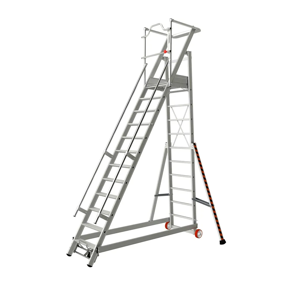 Dank der drei Rollen lässt sich die mobile Plattformleiter leicht im Lager oder Werkstatt bewegen. Die Rückseite kann direkt an eine Wand gestellt werden, wodurch Platz gespart wird – ideal für kompakte Arbeitsbereiche. Für zusätzliche Standfestigkeit wird die Treppe mit zwei klappbaren Stabilisatoren geliefert.