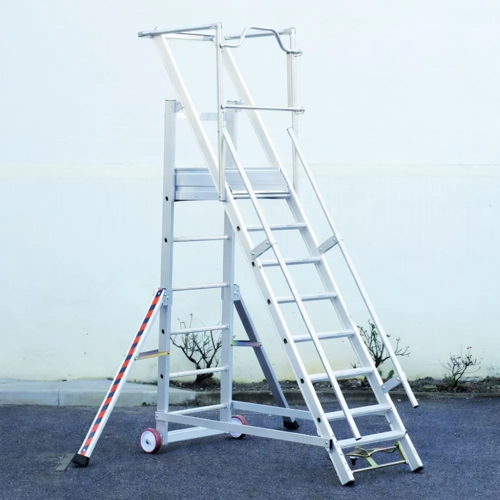 Dank der drei Rollen lässt sich die mobile Plattformleiter leicht im Lager oder Werkstatt bewegen. Die Rückseite kann direkt an eine Wand gestellt werden, wodurch Platz gespart wird – ideal für kompakte Arbeitsbereiche. Für zusätzliche Standfestigkeit wird die Treppe mit zwei klappbaren Stabilisatoren geliefert.