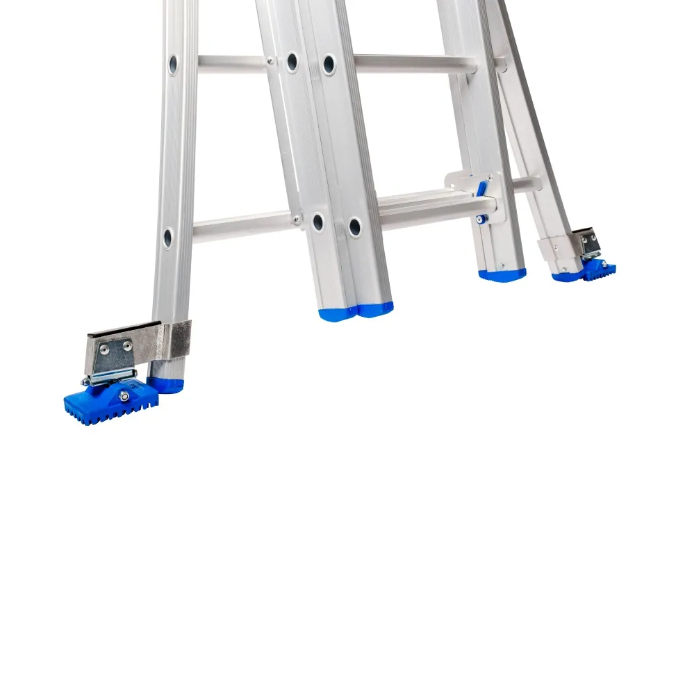 Cette échelle transformable à trois éléments est entièrement coulissante, démontable et transformable en échelle double (position A), ce qui la rend adaptée à une grande variété de travaux en hauteur. Lorsqu’elle est utilisée comme escabeau, l’accès se fait en toute sécurité par le côté étroit. L'échelle est équipé avec des roulettes de façade et des pieds élargis.