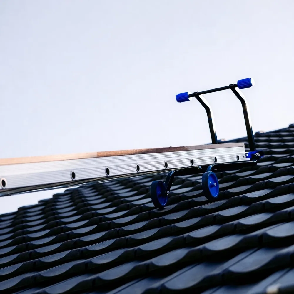 Dankzij de speciale constructie met extra hoge zijkanten en houten profielen aan de onderkant, worden de leien of pannen niet door de voeten van de dakwerker of het aluminium gedeelte geraakt en voorkomt men beschadigingen aan het dak.