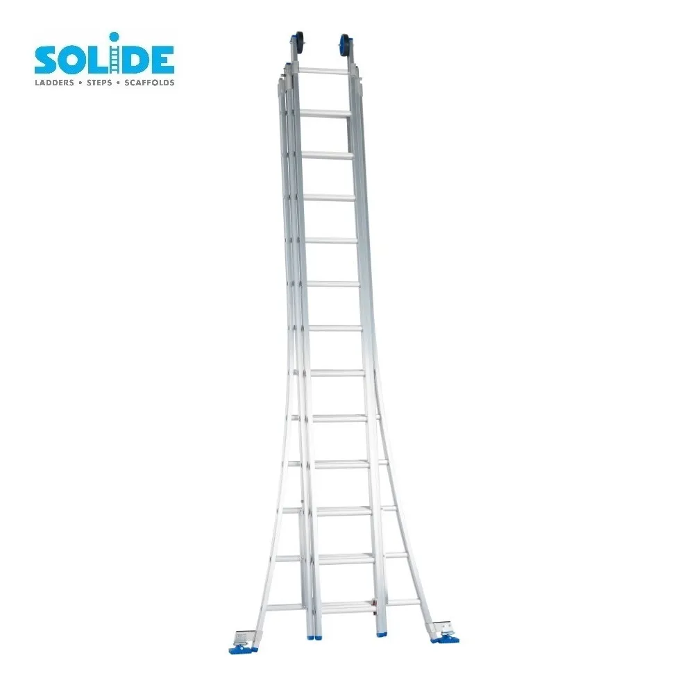 De Solide reformladder 3x12 sporten is een robuuste en veelzijdige professionele industriële ladder, ontworpen voor intensief gebruik door vakmensen. Dankzij de uitgebogen ladderbomen, het brede sportoppervlak en de horizontale stand van de sporten biedt deze ladder optimaal werkcomfort en veiligheid.